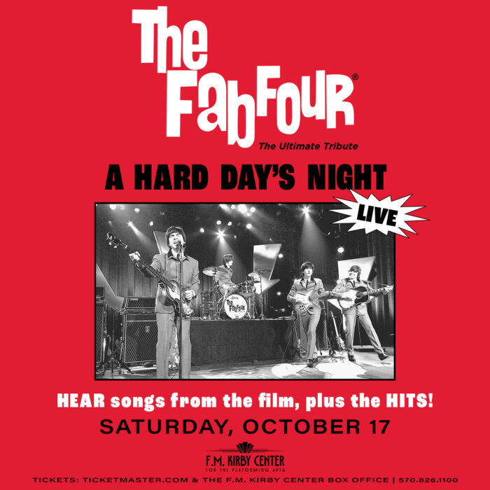 The Fab Four celebrates the Beatles’ first film, “A Hard Day’s Night,” with a set list featuring the film’s soundtrack plus other Beatles hits at the F.M. Kirby Center for the Performing Arts in Wilkes-Barre, PA, on Saturday, October 17th, 2026.