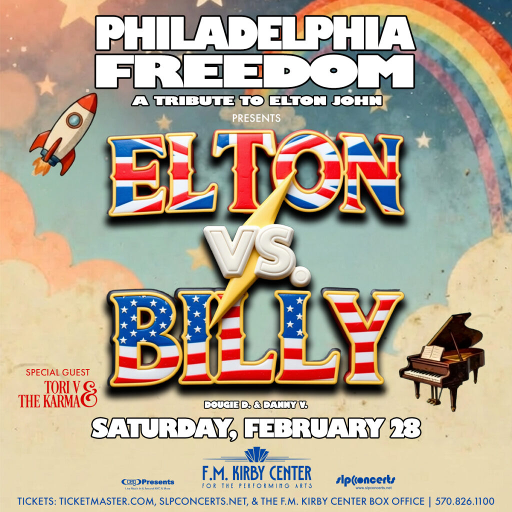 It’s Rocket Man vs. Piano Man when Philadelphia Freedom presents ELTON VS. BILLY at the F.M. Kirby Center for the Performing Arts in Wilkes-Barre, PA, on Saturday, February 28th, 2026, at 7:30 P.M. During the event, exciting Elton John tribute Philadelphia Freedom and Danny V from Billy Joel tribute the 52nd Street Band will play songs from both iconic artists. The show will also feature special guests Tori V & The Karma.