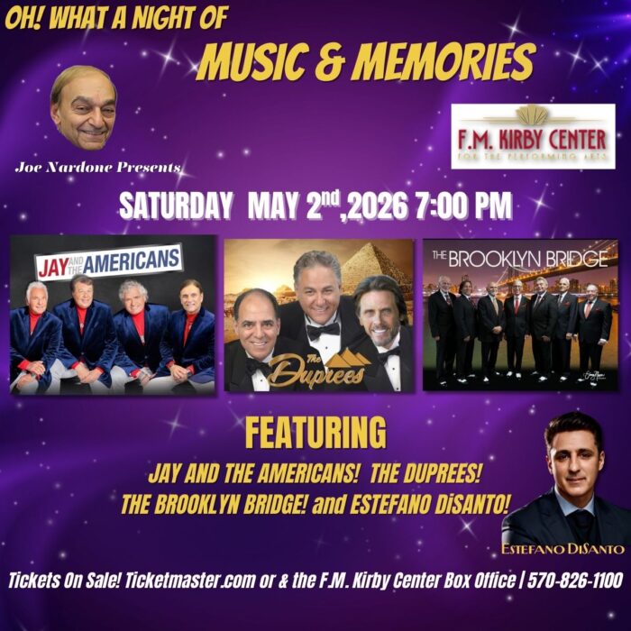 Jay and the Americans, The Brooklyn Bridge, The Duprees, and E’Stefano DiSanto take the stage during Joe Nardone Presents: Oh! What A Night of Music & Memories at the F.M. Kirby Center for the Performing Arts in Wilkes-Barre, PA, on Saturday, May 2nd, 2026, at 7:00 P.M.