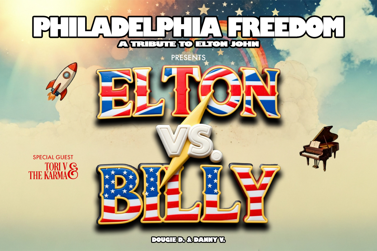 Get ready for an electrifying tribute experience as Philadelphia Freedom presents Elton VS. Billy, a spectacular celebration of two of the greatest singer-songwriters of all time: Elton John and Billy Joel! Frontman Doug Delescavage channels the magic of Sir Elton, while the stage ignites with the dynamic energy of special guest Danny V—a veteran performer from the renowned 52nd Street Band a tribute to Billy Joel. Prepare for an unforgettable night of hits like “Rocket Man,” “Piano Man,” “Bennie and the Jets,” and “New York State of Mind.” This isn’t just a concert; it’s a high-octane musical showdown! Don’t miss the chance to hear these iconic catalogs performed live.